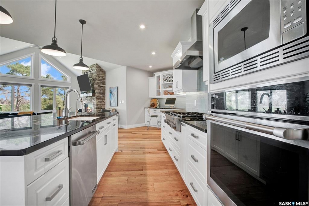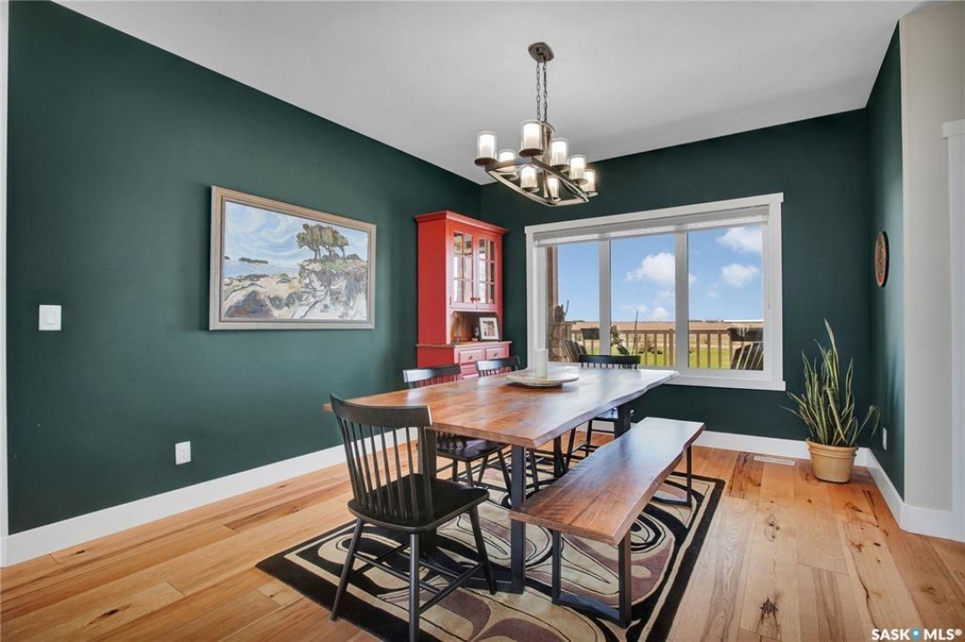 This beautiful, private acreage features 5 bedrooms, 4 bathrooms, a triple-car attached garage, and multiple outbuildings. Located just 22 minutes from Saskatoon, this acreage sits just outside the town of Delisle which features all amenities such as schools, grocery, gas, recreational activities and more. This 2020 built bungalow was customized with high building standards. The veranda at the front of the home provides entry into both the dining room and front hall. The spacious front entry gives access to the triple attached heated and insulated garage, half bathroom and main floor laundry room. The kitchen offers a large island, custom soft closet cabinets and drawers, glass tiled backsplash, quartzite countertops, large pantry and Jenn Air appliances. The kitchen is open to the family room with vaulted ceilings, a propane fireplace and large windows providing both a scenic view and an abundance of natural light. The sun room is fully insulated and can be used year round with a space heater or by leaving the doors open to the main living space. The great room boats 18ft ceilings and a second propane fireplace. Down the hall are three bedrooms including the master suite and the main bathroom. The master offers a walk in closet, five-piece ensuite with a water-air tub, separate stream shower, double sinks and access to the back deck. The outbuildings include the following: Quonset (42 X 70), Shop (20.5 X 33), Horse Stable, 24.5 X 14.5). The workshop is heated and insulated. The large Quonset is finished with a concrete floor and large double doors. The horse stable features two sliding doors and is perfect for horses. The home is finished with 50 year fiberglass shingles, commercial grade ROXUL insulation, triple pane windows, fiberglass doors, high efficient furnace and 100 gallon hot water tank with circulation system. There is a two stage system septic field with pump out and 1500 gallon – fiberglass tank.
