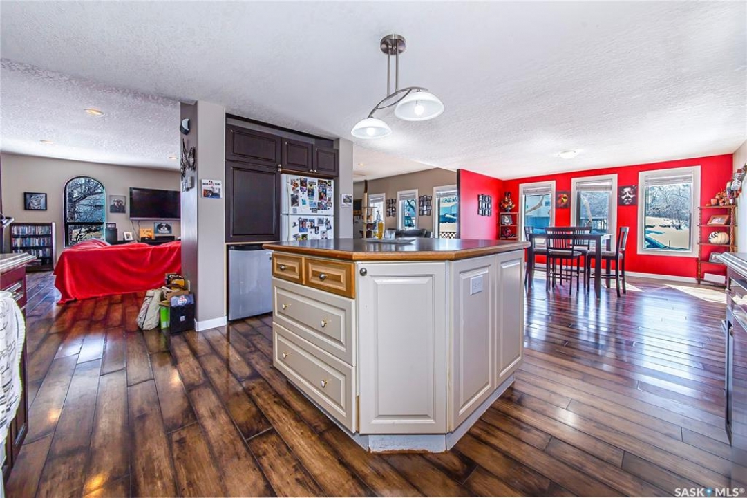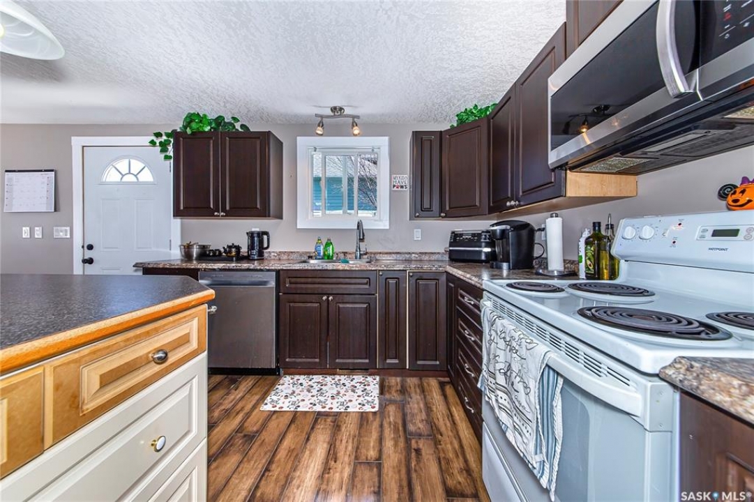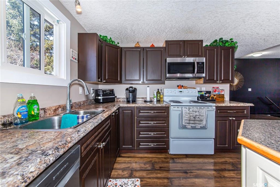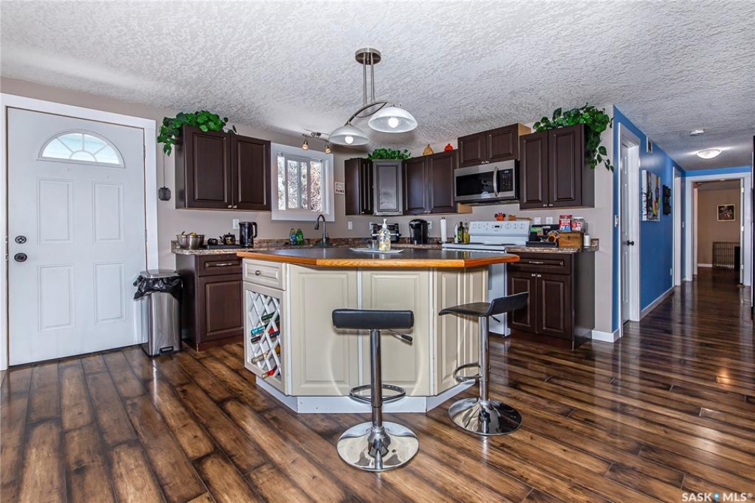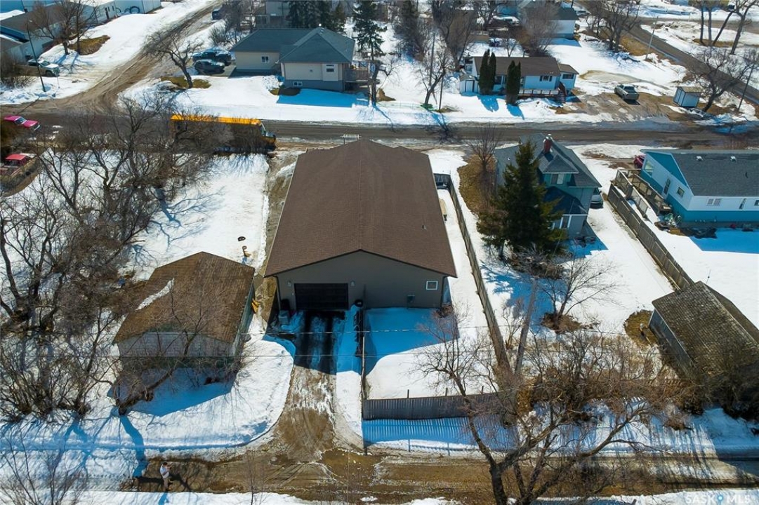 So, would you like to live in one of the Coolest Homes, Ever!!!!!!! From the 1st step into the front yard, there's a very cozy coffee deck off the front entranceway and one around the side to either be in or out of the sun. Niiice. Open the front door and WOW!!!!! Huge, wide open floor plan with so much potential to be anything you'd like it to be. The current owners have it decorated co cool. It is set up for entertaining and livin' the good life. Loads of cabinets and a nice sized island to doll this kitchen up. Fridge, stove, built in dishwasher, Microwave hood fan for easy living. Master bedroom has a walk in closet and a 3 pc ensuite bathroom, 2nd bedroom and a 2nd 3 pc bathroom and another room used as a den and storage room. Super wide staircase that goes down to the basement and opens up to a Funky Jam Session Area and a large family room!!!!!!! There's an area that could be turned into a potential 3rd bedroom and there's roughed in plumbing for a 3rd bathroom, as well. Huge utility room/laundry area with upgraded 200 amp panel and an on demand water heater for endless supply of hot water. Oversized single heated garage with direct entry that could fit 2 smaller vehicles when it's 40 Below!!!!!!!!!! Come out for a drive if you're tired of the city rat race and check out some spacious, small town living.