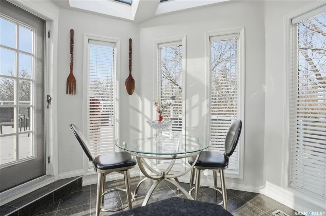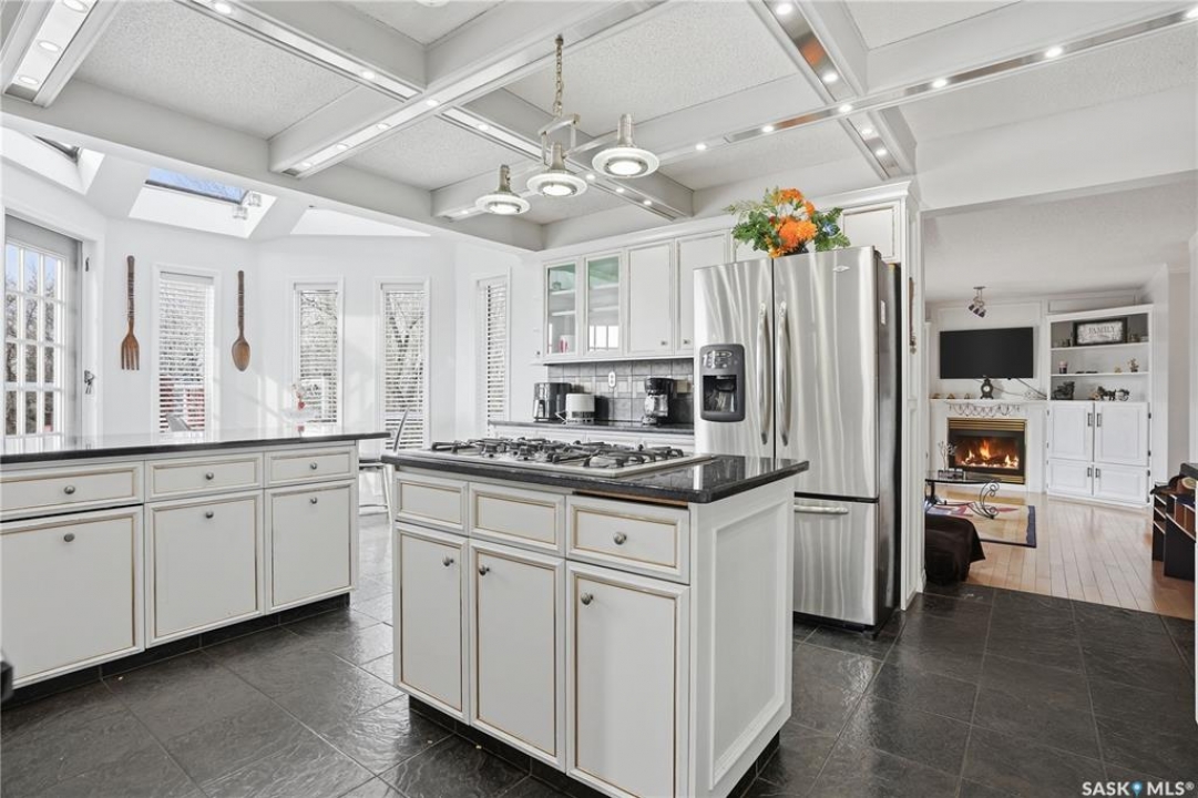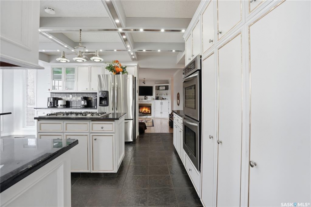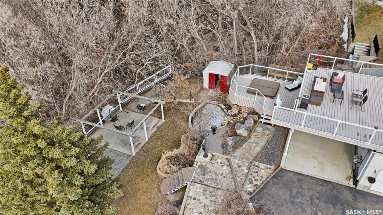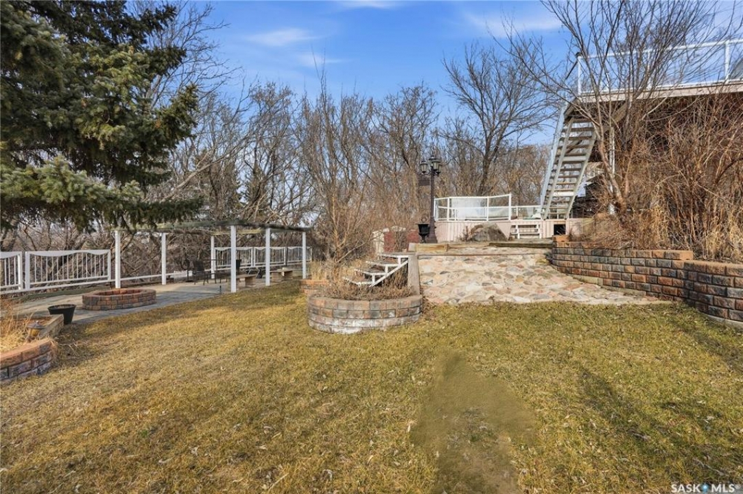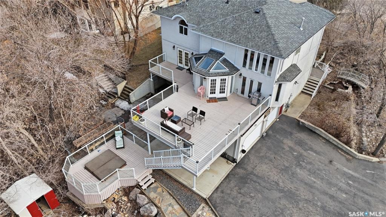 Explore this spacious executive home, offering over 3,900 sq. ft. of finished living space, including a walkout basement. This property features 5+2 bedrooms, a bonus office on the main floor, and a den with custom-made closets in the basement, along with 4 bathrooms. Set in the serene hills of Lumsden, this home offers charming landscaping and the promise of resort-style living. Although recent renovations have updated several areas of the upper floors, the home presents opportunities for personal touches and further enhancements. Located on a corner lot in a sought-after hillside area, this villa is conveniently situated just minutes from Regina Beach and other nearby beaches. The main floor features a welcoming foyer with a curved staircase, nine-foot ceilings, and a functional kitchen that opens to a sunlit dining area, enhanced by three skylights and wraparound windows. The expansive living room provides lovely sunset views, while the adjacent family room with a fireplace offers a cozy retreat. Patio doors lead to multiple seating areas and a large deck overlooking the valley—a great space for outdoor gatherings. Upstairs, the primary suite provides a 5-piece ensuite and a walk-in closet, along with a sitting area that captures scenic views of the Lumsden hills. The finished walkout basement adds valuable extra living space, including a wet bar large storage room with built in cabinets, 3pc bath and direct entry to over sized double garage. This home has tons of outdoor living space making it truly appealing!