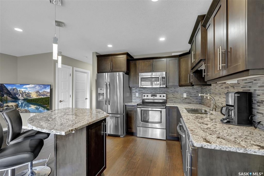 Welcome to this town home in The Creeks in terrific condition. Large foyer upon entering with conveinient direct entry door to single attached garage, also a 2 piece powder room. Main floor open concept. Kitchen with granite counters and back splash stainless steel appliances included. Combined DR/ LR. Garden door leading to back private yard. 2nd floor has 2 good sized bedrooms both with 4 piece ensuites one with soaker tub and double sinks , walk in closet. Second bedroom also a good size. Laundry area on this level also. Nicely finished lower level offers additional space for living, features a gas fireplace. A 4 piece bath on this level as well. Condo is in excellent move in condition.