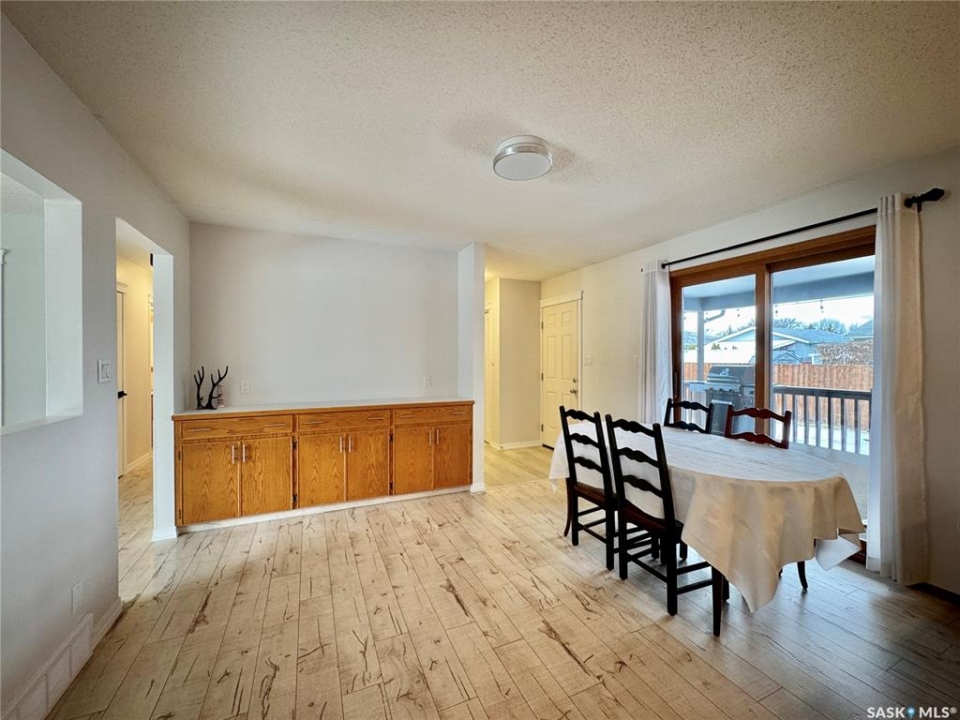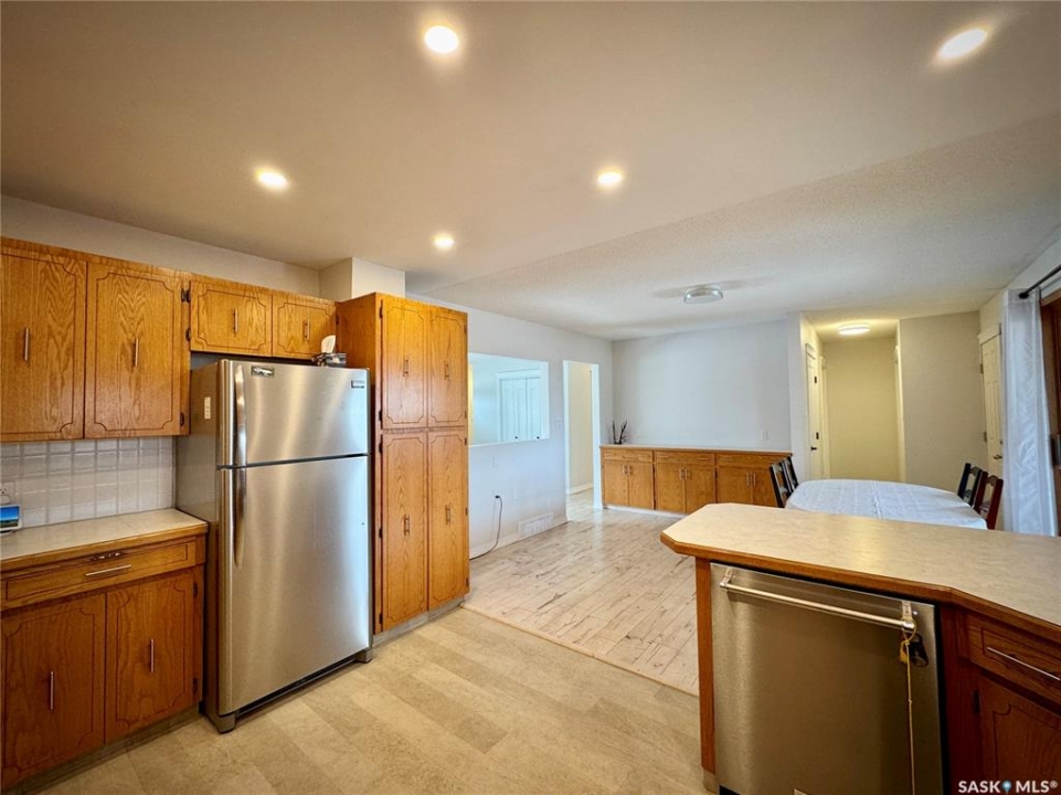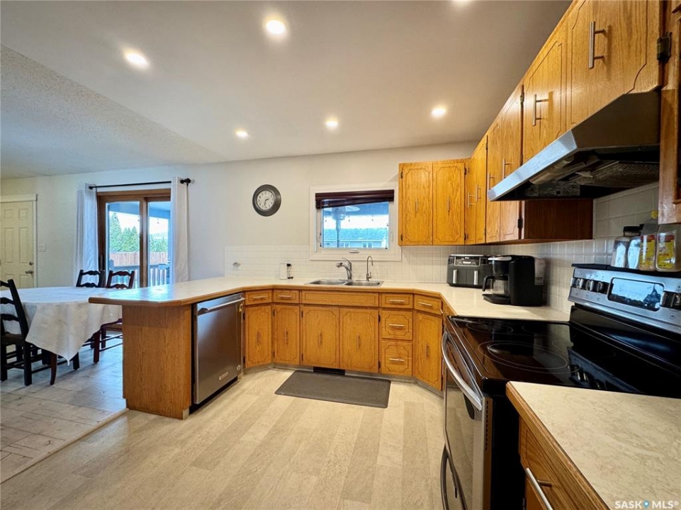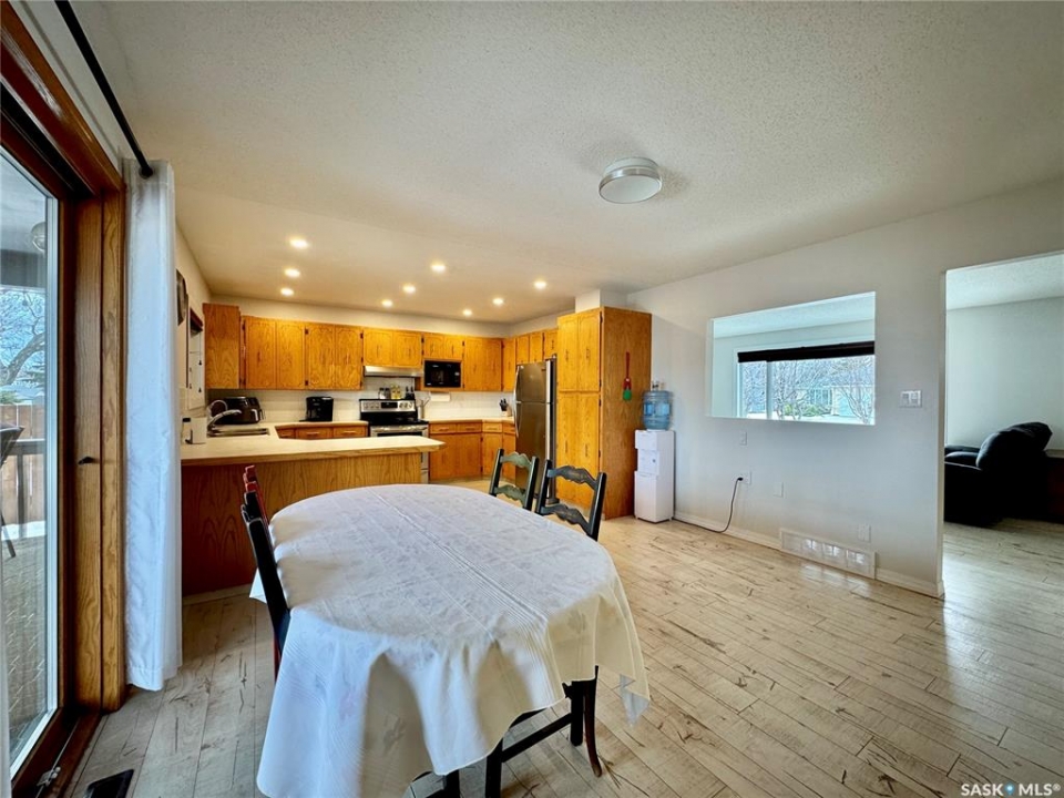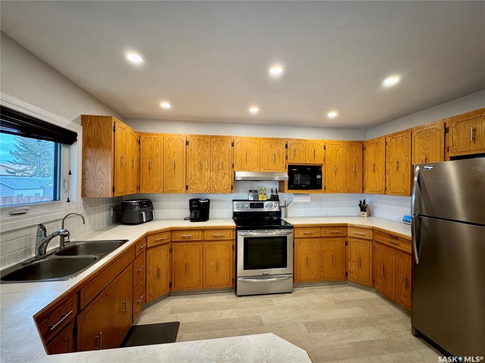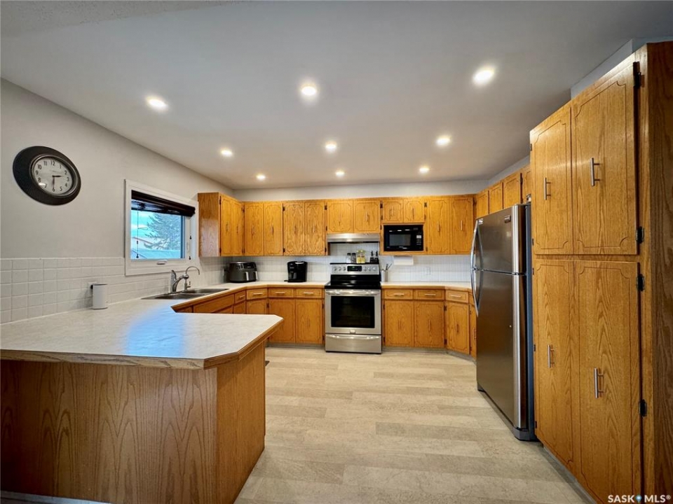 Welcome to Stanley Street—where thoughtful updates, generous space, and family-friendly function all come together in one beautifully-maintained Esterhazy home. From the moment you pull into the concrete drive, this property makes an impression with its striking curb appeal, updated exterior finishes, and insulated double attached garage complete with stylish modern doors and convenient man-door access. Inside, the main floor offers bright, inviting living spaces with updated lighting throughout, fresh trim and interior doors, and a layout designed for everyday ease. The spacious living room flows into a dining area built to host the whole crew, anchored by a substantial buffet-style cabinet wall and room for even the largest family table. The kitchen is equally impressive with stainless steel appliances, abundant cabinetry, generous counter space, and LED pot lighting that keeps everything bright and functional. Two spacious bedrooms are located on the main level, including a primary suite large enough for a king-sized bed, complete with a 2-piece ensuite and well-appointed IKEA PAX wardrobes for exceptional storage. Main floor laundry adds everyday convenience, perfectly positioned near both the bedroom wing and rear entry. Downstairs, the fully-developed basement expands your living space with updated carpet, a large den with wet bar, and three additional bonus rooms with smaller windows that don't quite fit today's egress standard - these spaces offer flexible options for guests, hobbies, office space, or overflow family use. Step outside and you'll find a backyard designed for enjoyment: an oversized covered deck with natural gas BBQ hookup, fully fenced yard, storage shed, and a tucked-away side kennel area with direct pup-door access from the garage. Add in central air, weeping tile, a well-cared-for basement, this home delivers the kind of comfort and confidence every family is searching for.