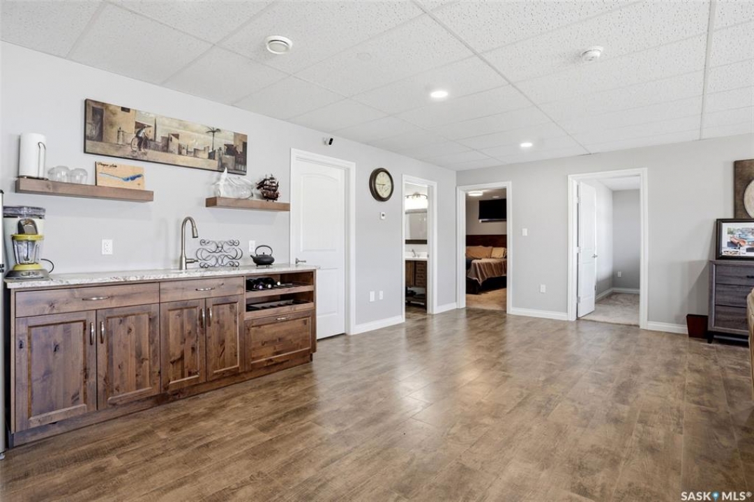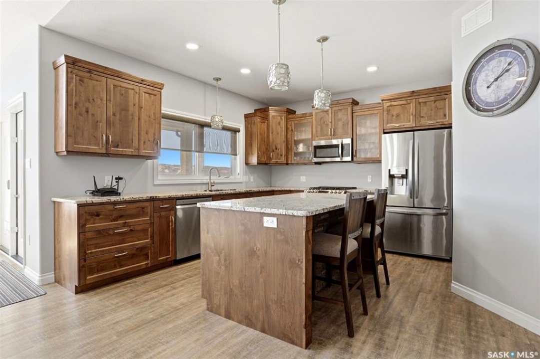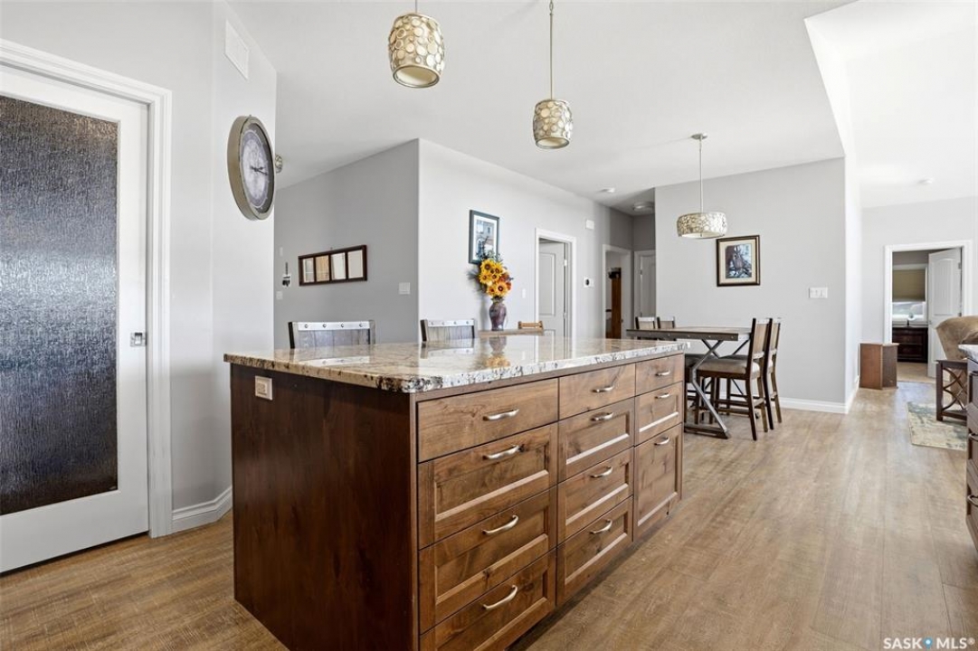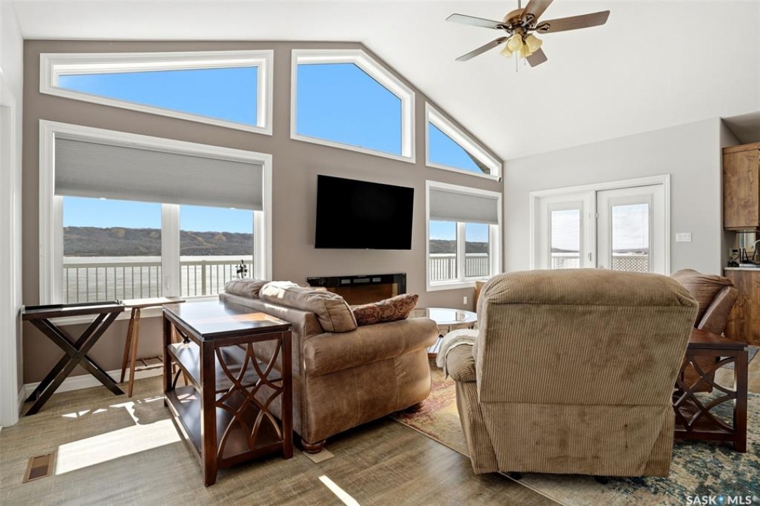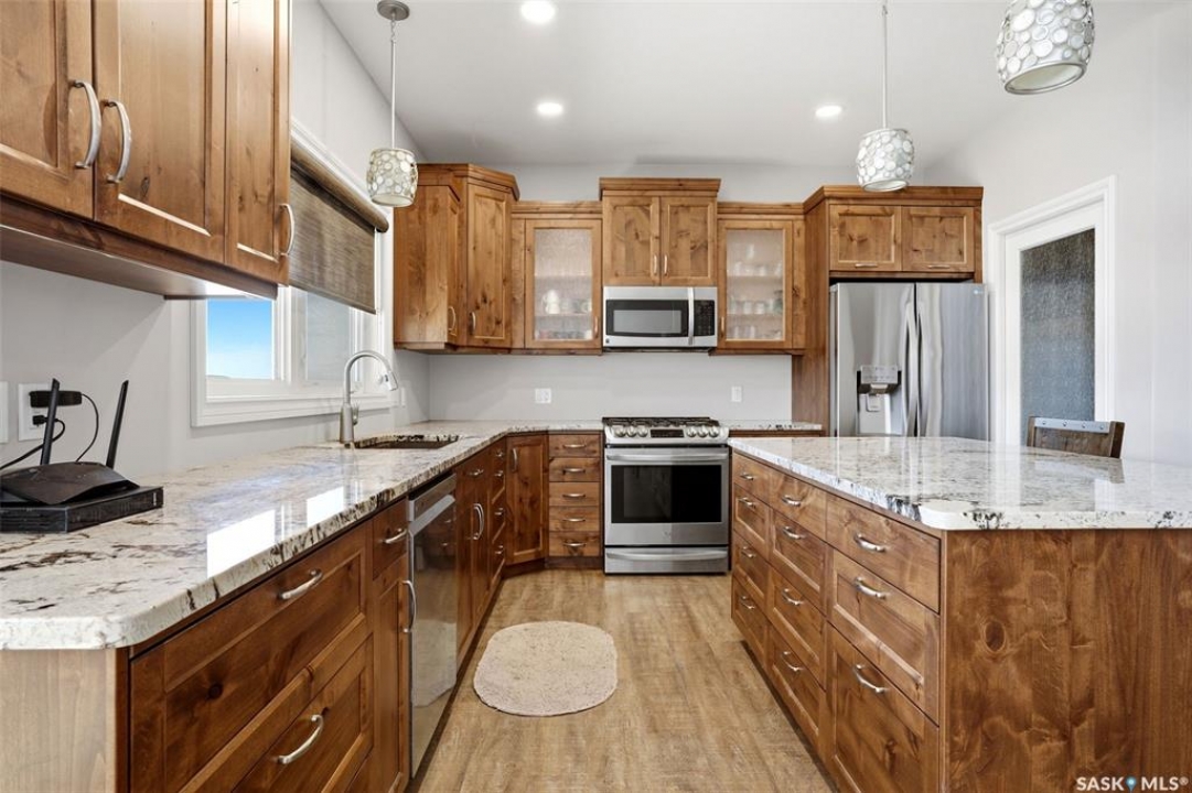 Lakefront living on beautiful Pasqua Lake with panoramic water views from nearly every living space! This thoughtfully designed walkout bungalow offers 1,566 sq. ft. above grade on a 0.22-acre waterfront lot with direct lake access, a double attached garage, & exceptional energy-conscious features including solar panels, backup generator, & 200-amp electrical. Exterior is finished in stucco with a durable metal roof, while the insulated double attached garage includes metal cladding, floor drain, & plumbing in place for future in-floor heat. A mudroom connects the garage to the home & is also finished with metal cladding for durability. Inside, the custom-built kitchen is designed for both function & entertaining, featuring a large island, granite countertops, soft-close cabinetry, pantry, stainless steel appliances, built-in dishwasher, gas stove, microwave, fridge, & freezer included. The main floor offers 3 bedrooms, including a spacious primary retreat with abundant natural light, walk-in closet, and generous 3-pc ensuite. A dedicated main floor laundry room & an additional 4-pc bathroom complete the level. The living room is framed by expansive windows that fully capture the lakefront setting, anchored by an electric fireplace & offering 2 separate accesses to the upper deck overlooking the water. The walkout lower level continues the lake views with a large family room featuring a natural gas fireplace, wet bar, in-floor heat, & 2 separate sets of French doors leading directly to the lower lakeside patio. This level also includes 2 additional bedrooms, a den ideal for a home office or exercise room with lake views, storage room, utility room, & extensive mechanical systems including pumps, water filtration, on-demand hot water, & natural gas forced-air heating. Gravel driveway, storage shed, excellent storage throughout, & a layout designed to fully embrace lake life make this an outstanding year-round property!