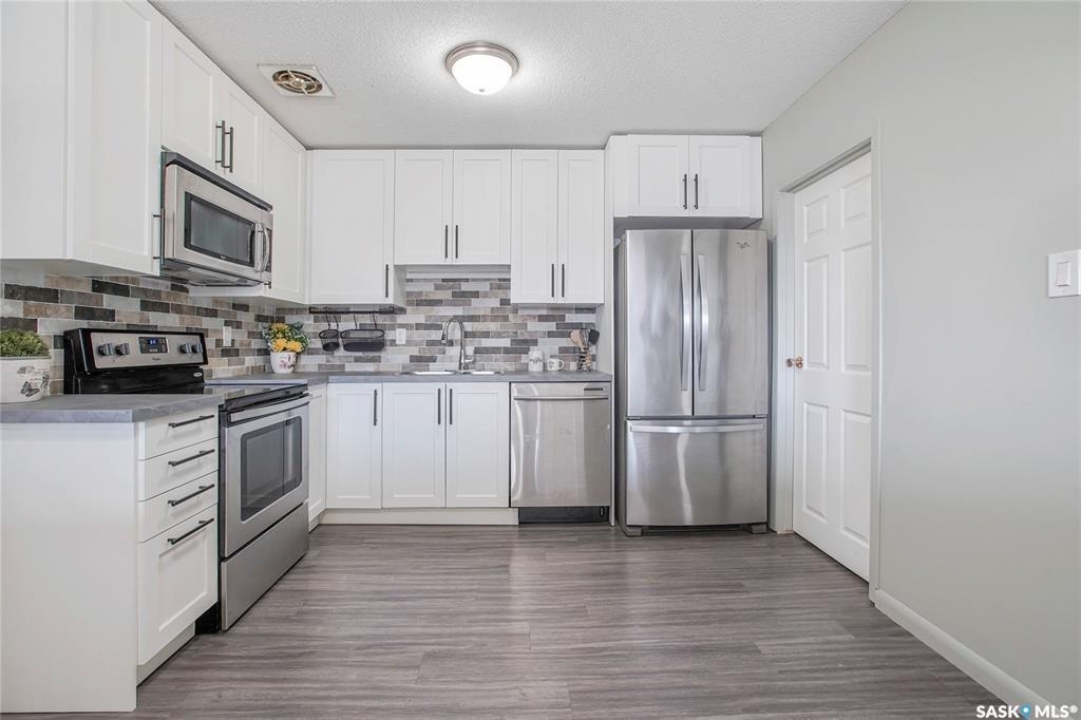 Welcome to 32–3113 7th Street East in the heart of Brevoort Park! This bright top-floor corner unit is perfectly located close to schools, shopping, grocery stores, public transit, and all essential amenities, making it an ideal choice for first-time buyers, young families, students, or savvy investors. This beautifully updated 2-bedroom, 1-bathroom third-level suite features numerous renovations, including a modern kitchen, refreshed bedrooms, and a stylish bathroom, creating a clean and inviting living space. The spacious layout offers well-sized bedrooms and a large kitchen that opens to the living room, complete with L-shaped cabinetry, tile backsplash, new flooring, a dedicated dining area, and a generous walk-in pantry. The upgraded bathroom boasts a luxurious full-tile shower and tile flooring, while additional highlights include shared laundry on the lower level, one electrified exterior parking stall, and thoughtful upgrades throughout that reflect true pride of ownership. Affordable and move-in ready, this home is priced to sell—book your private showing today!