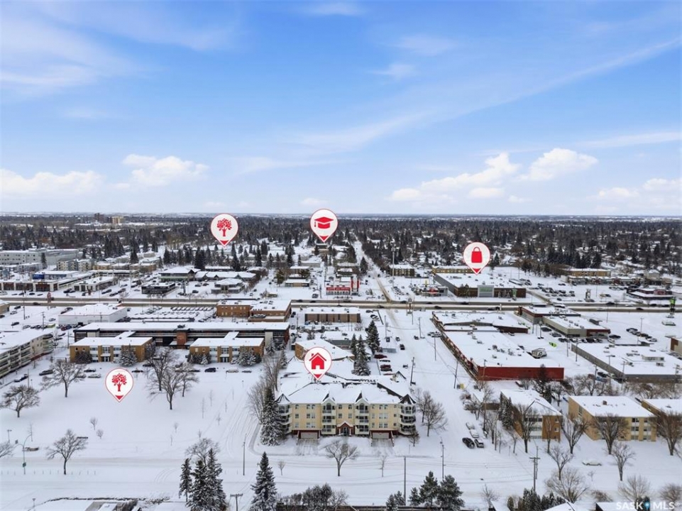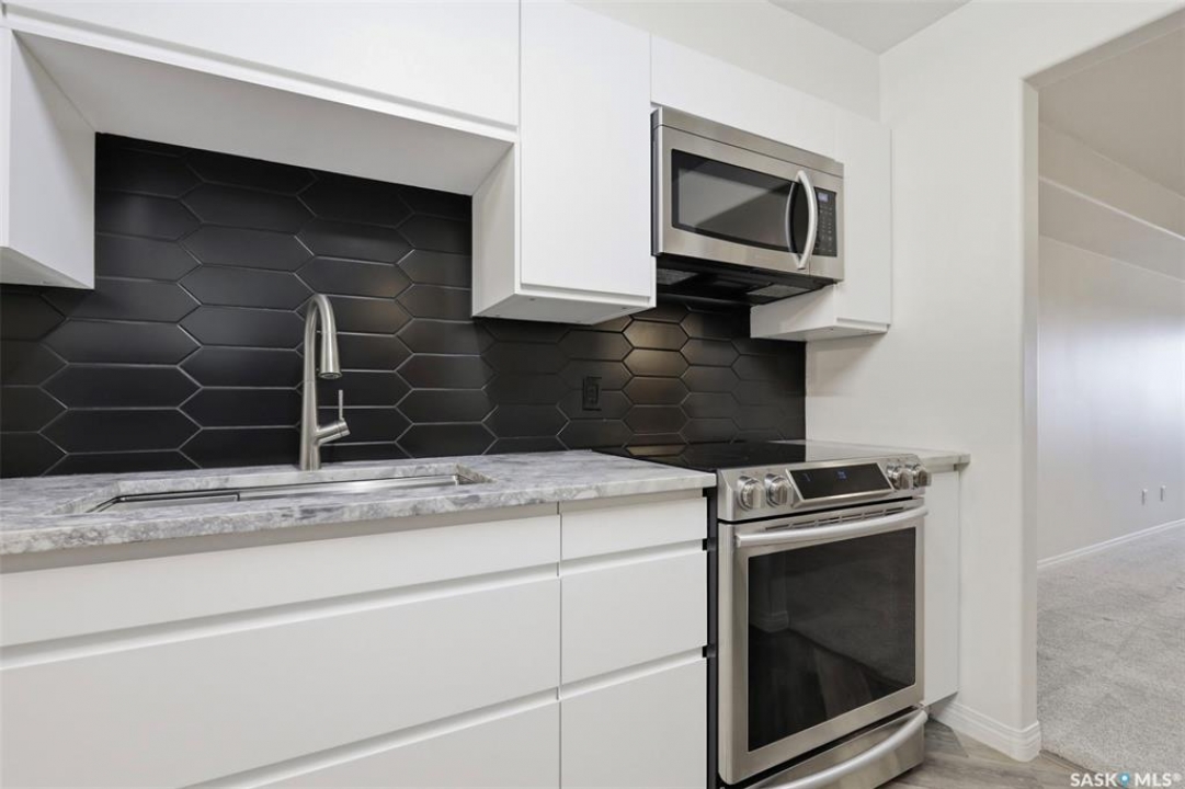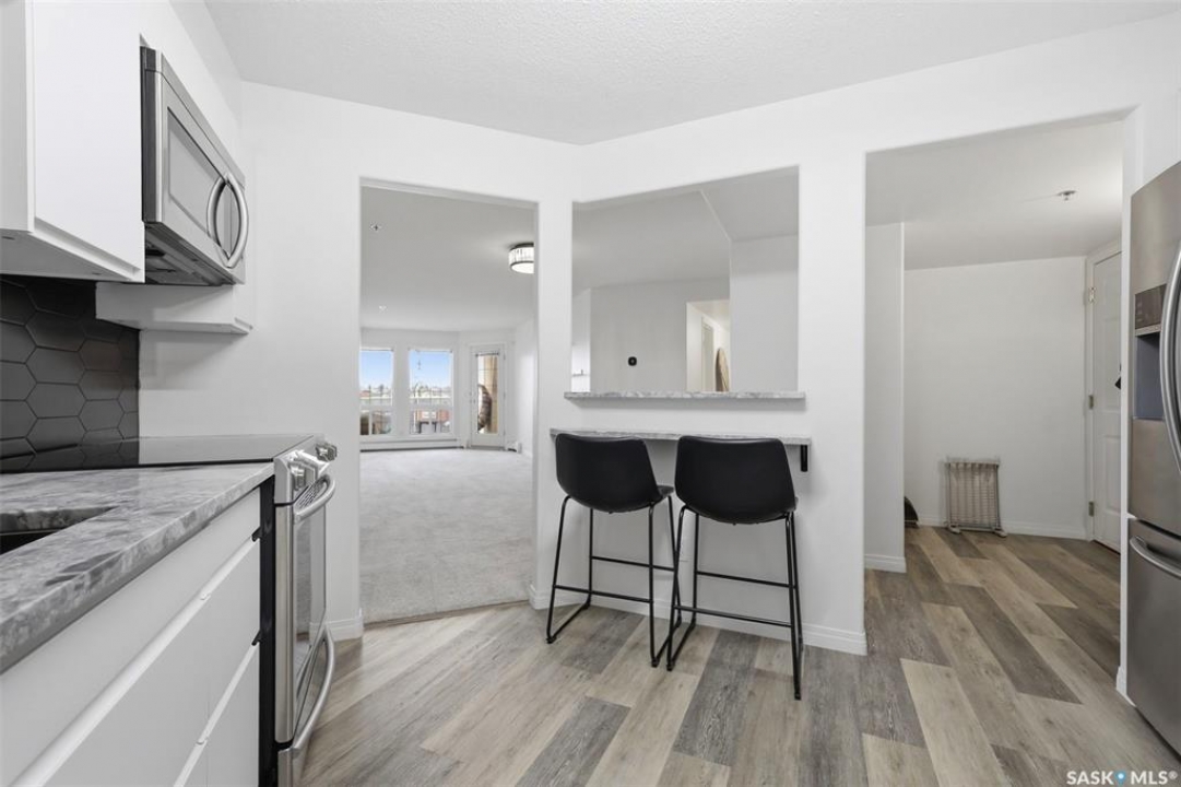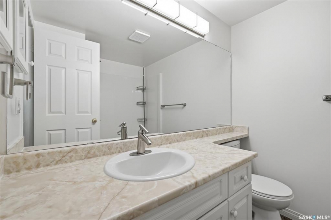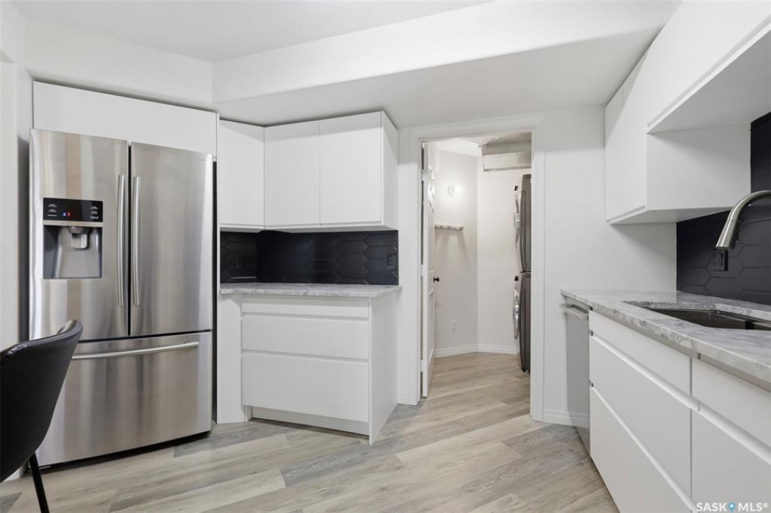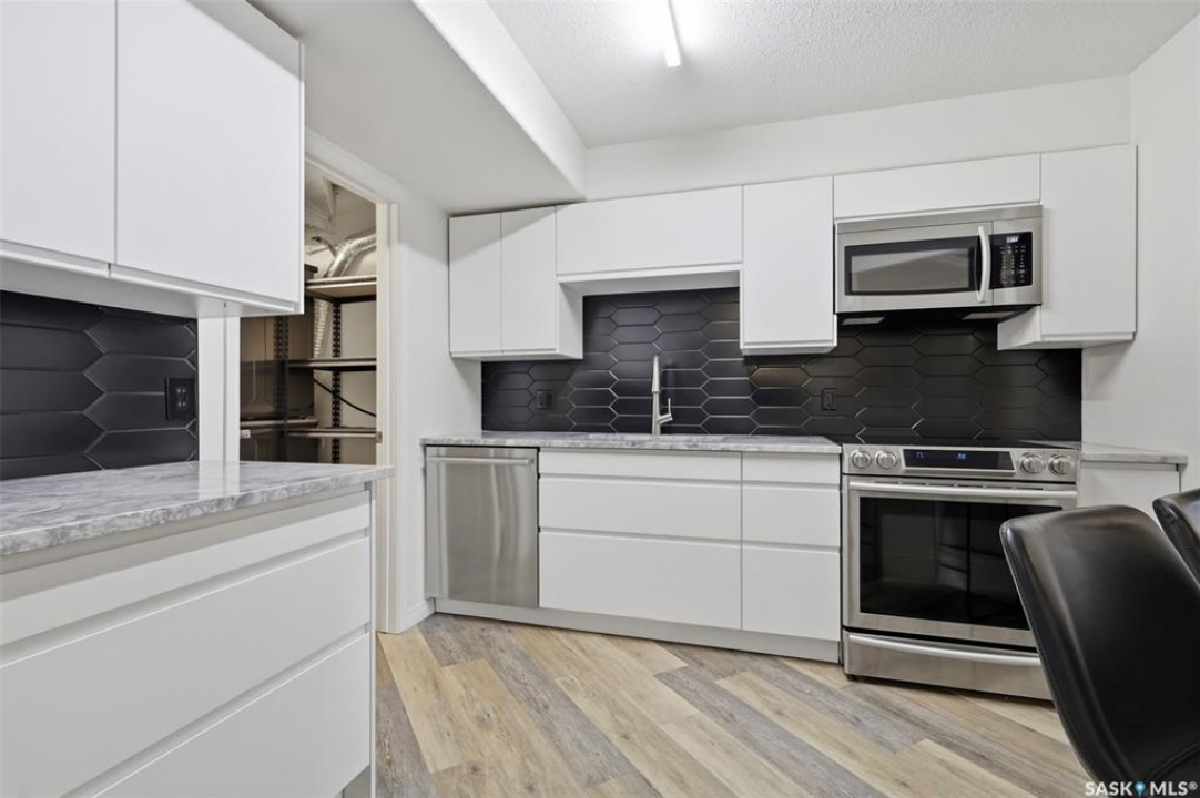 Welcome to this beautifully renovated 1,100 sq. ft. condo in the highly sought-after, family-friendly neighborhood of Grosvenor Park. Perfectly located near the university, major bus routes, and all the amenities along 8th Street, this home offers both convenience and comfort. Step inside to discover a bright, open-concept layout seamlessly connecting the living, dining, and kitchen areas—ideal for both everyday living and entertaining. The stunning new kitchen features quartzite countertops, a trendy tile backsplash, sleek new appliances, and modern finishes throughout. Durable and stylish vinyl plank flooring flows effortlessly across the entry and kitchen. This condo offers a unique and very functional layout with both bedrooms, including a primary bedroom complete with a private 3-piece ensuite, and walk in closet are tucked to the one side of the unit. An additional updated 4-piece bathroom provides convenience for guests or family members. Additional highlights include one underground parking stall, a large storage locker, and a well-maintained self managed building in a prime location, saving on condo fees. Whether you're a first-time buyer, downsizer, or investor, this move-in-ready home checks all the boxes. Contact your favorite agent for your private showing today!