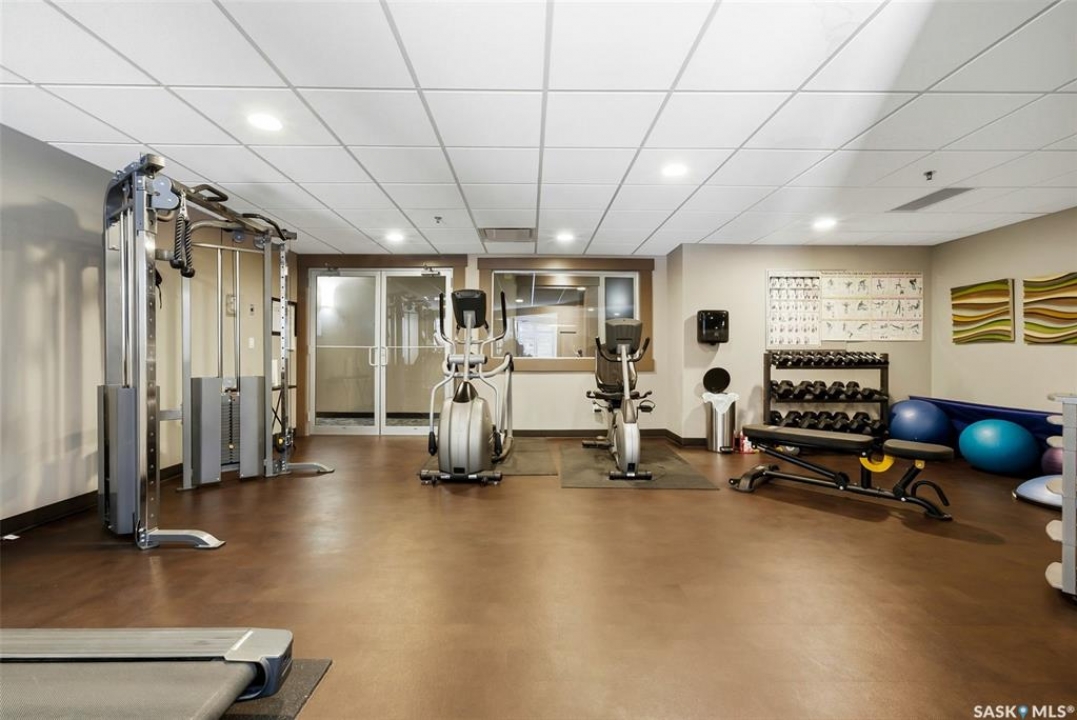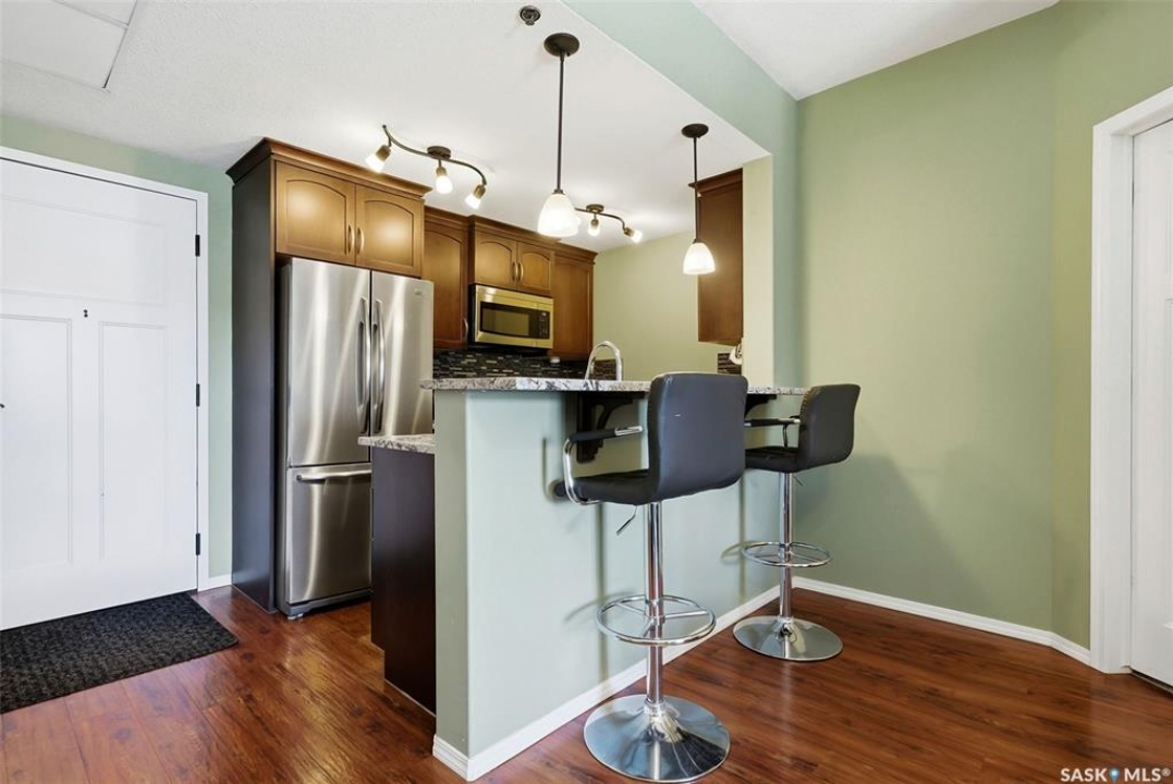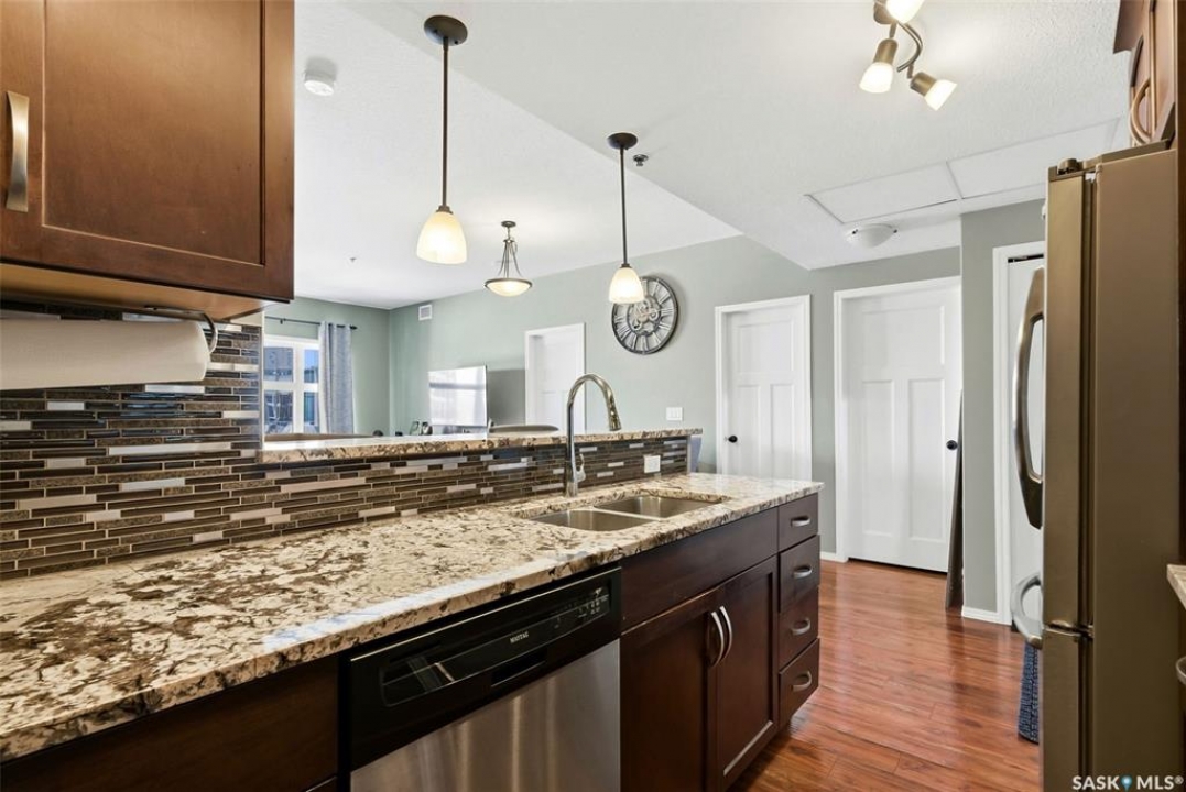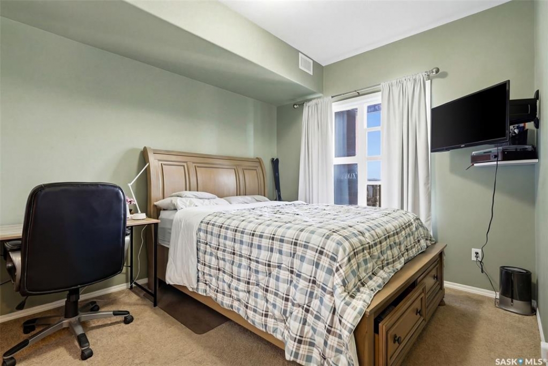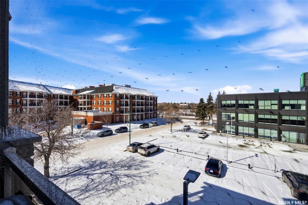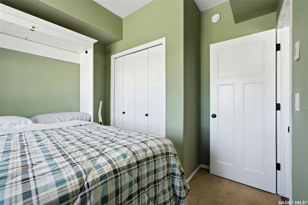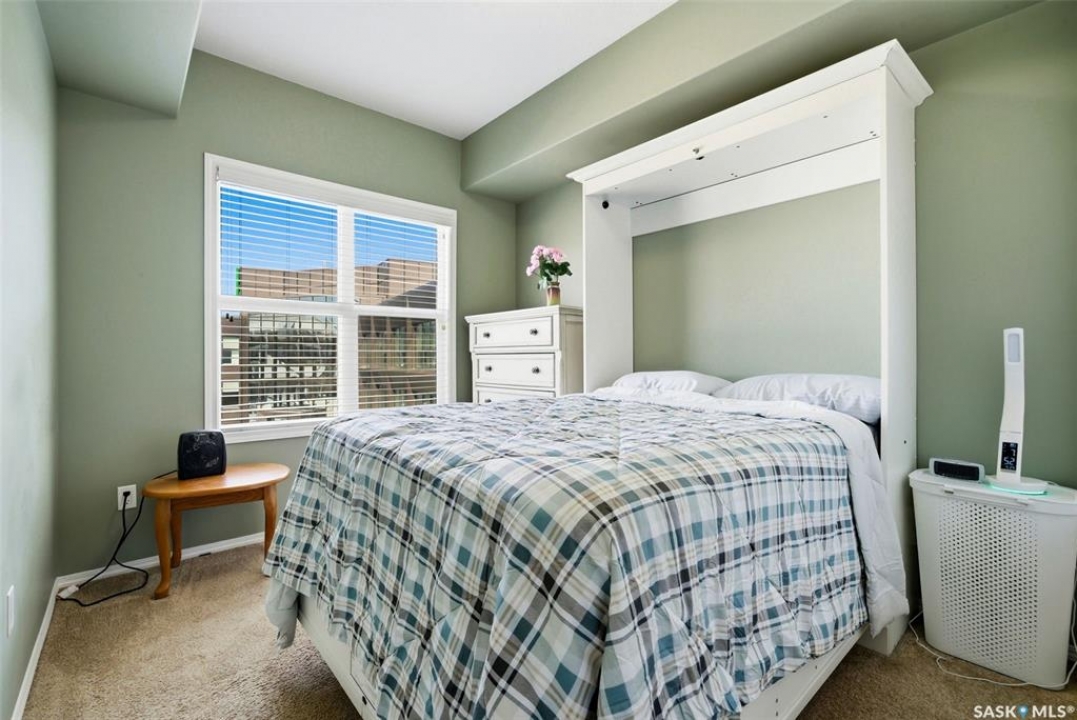 Welcome to this well-maintained 835 sq ft condo in the desirable Hillsdale neighborhood—just minutes from the University of Regina, Wascana Park, and downtown Regina. This bright 3rd-floor unit offers 2 bedrooms and 2 bathrooms, featuring 9' ceilings, granite countertops, and in-unit laundry for everyday convenience. The flexible second bedroom includes a Murphy bed—perfect for guests or a home office setup. Enjoy relaxing on the west-facing balcony with great natural light. The building includes an amenities room, exercise room, visitor parking, and the rare bonus of two underground parking stalls. A fantastic opportunity for students, professionals, or investors seeking a move-in ready property in a prime location.