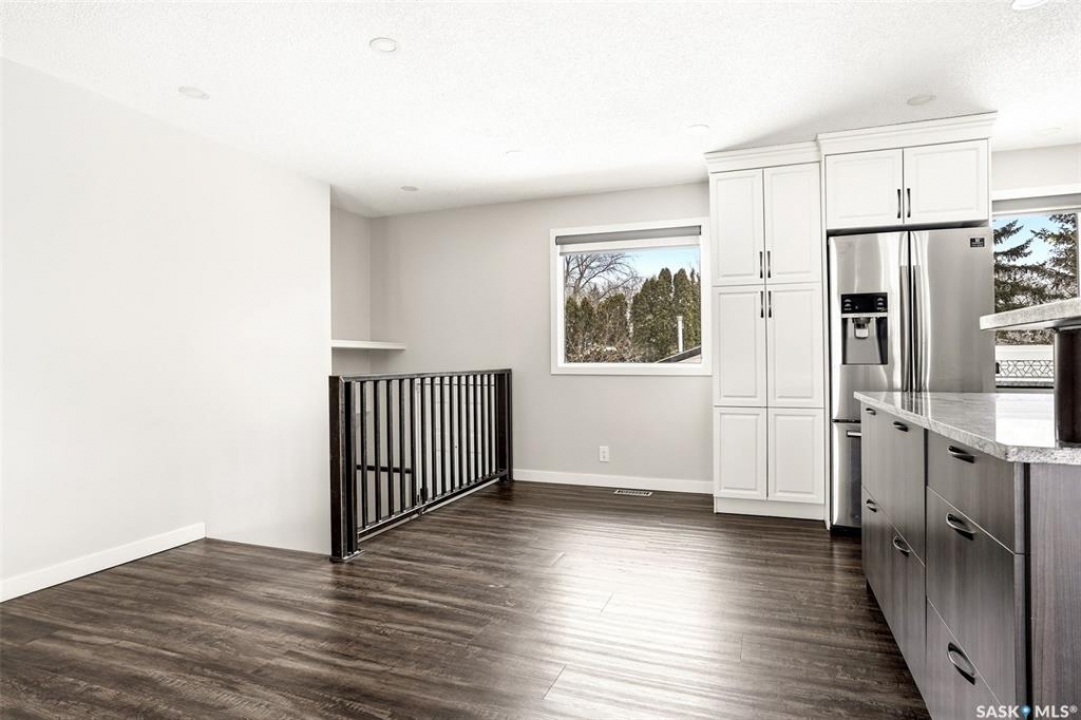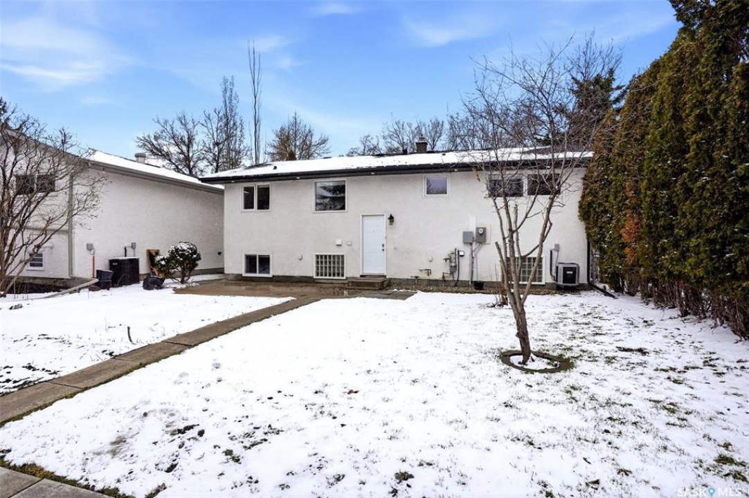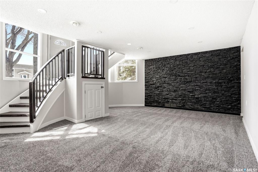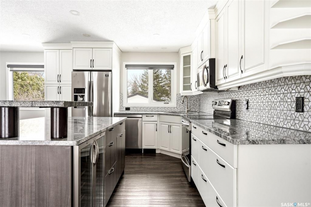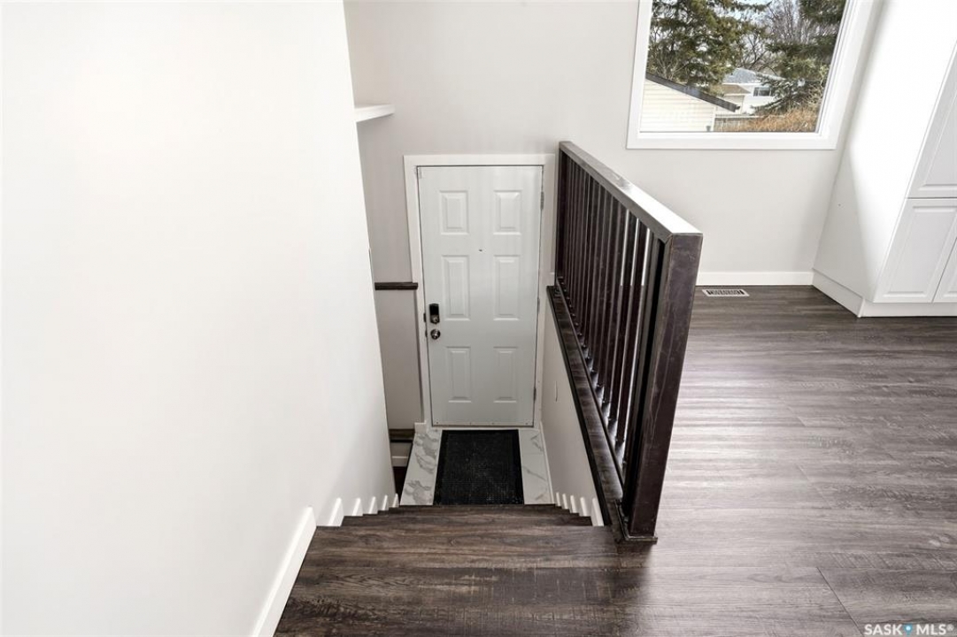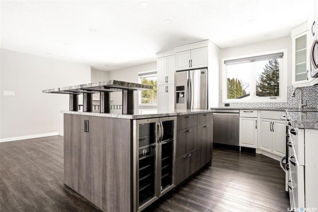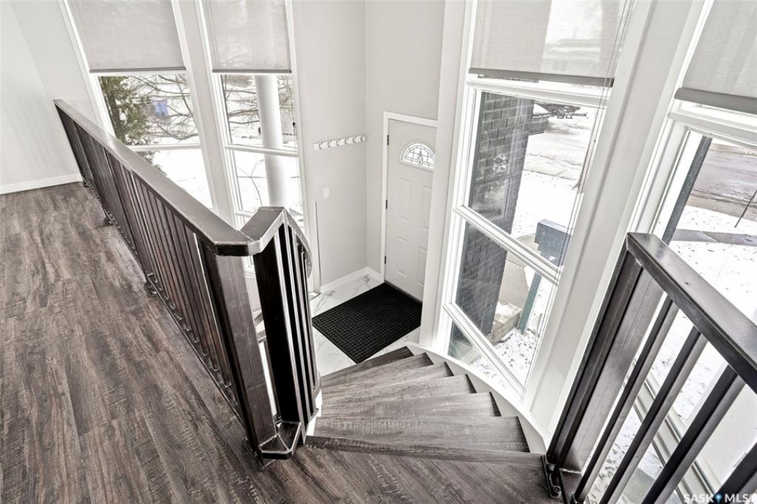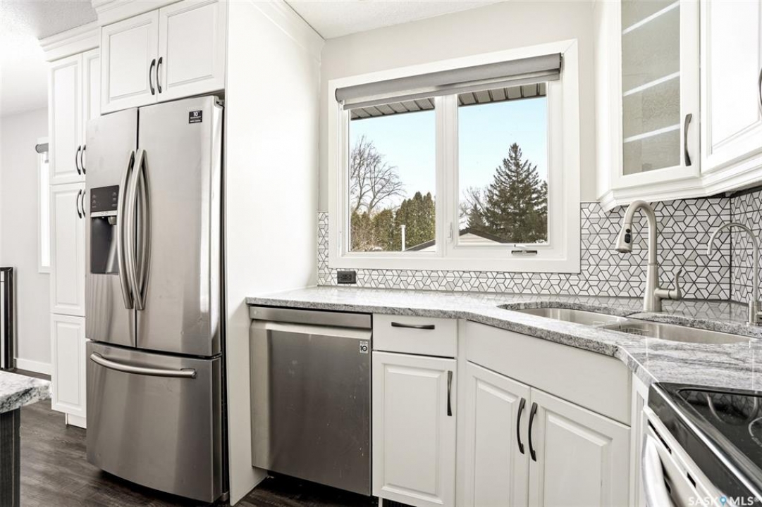 Amazing property located on a quiet bay in the mature neighbourhood of Walsh Acres. This beautifully updated home has been transformed into a modern, open-concept layout filled with natural light. The impressive foyer features dramatic two-storey windows and a striking curved staircase with custom metal railing. The main level has been opened up to create a spacious great room, complete with durable vinyl plank flooring throughout. The kitchen is both stylish and functional, offering white cabinetry, granite countertops, stainless steel appliances, tile backsplash, and a large 4' x 6' island with additional storage and pull-outs. A beverage fridge in the island is also included. Upstairs, you'll find three bedrooms. The primary bedroom includes a convenient two-piece ensuite with a newer countertop. The main bathroom has been refreshed with a granite-topped vanity and vinyl tile flooring. The fully renovated basement offers a bright and inviting space thanks to its large windows. The rec room features a stunning stacked stone feature wall, newer carpeting, and updated lighting. Two additional bedrooms with large windows and a beautifully finished bathroom—complete with a custom tiled shower and glass block accents—make this level ideal for family or guests. A newly added laundry room provides ample counter space, cabinetry, and extra storage. Additional updates include custom blinds (2022), new rubber shingles on the house (2023), new asphalt shingles on the garage (2023), and updated soffits and eaves. The double detached garage is fully insulated and equipped with a newer gas heater and electrical panel. Outside, the mature backyard offers a garden area, fruit trees, a walnut tree, and access to the garage via a paved lane. A newer double concrete driveway adds convenience at the front of the home. Close to schools and North end amenities. This move-in ready home truly has the WOW factor—don't miss your opportunity. Book your showing today!