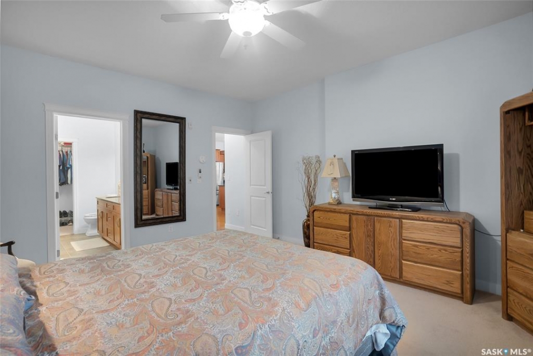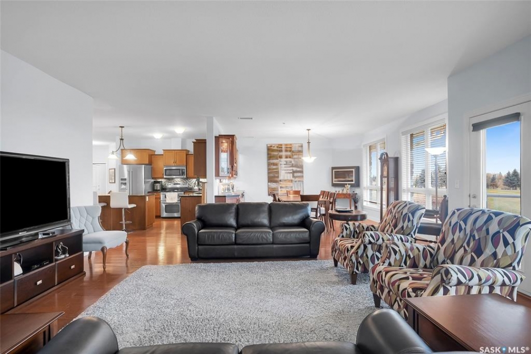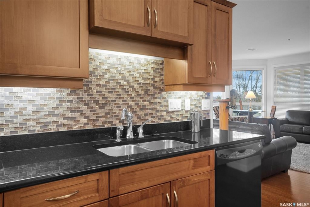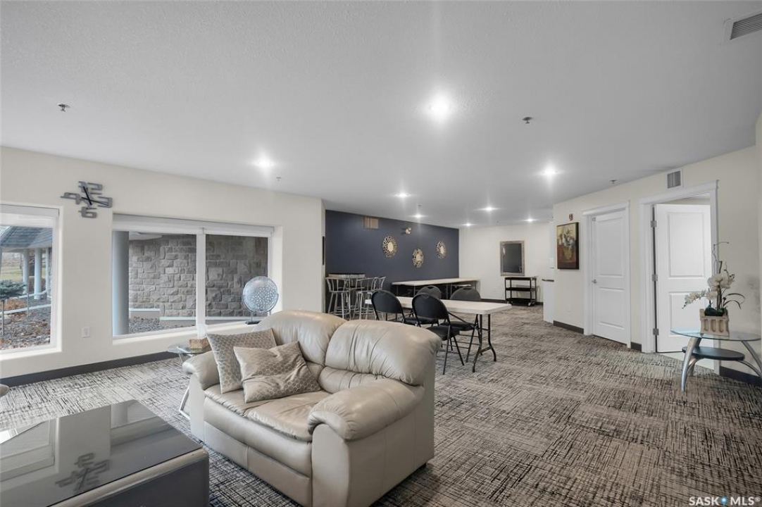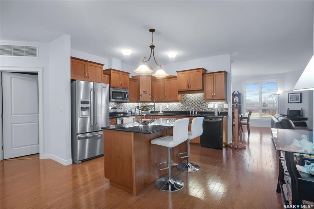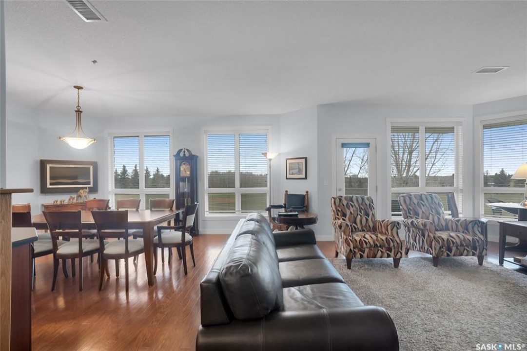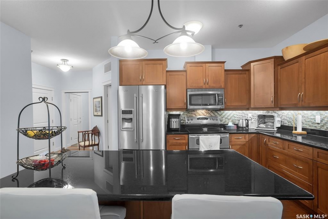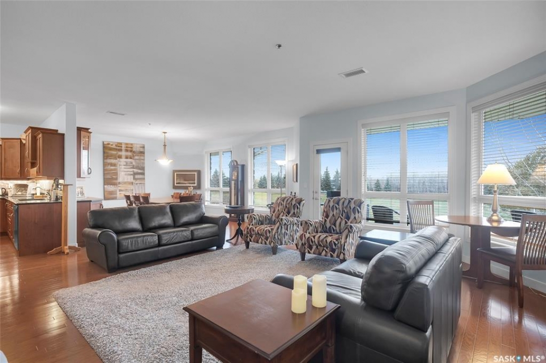 Stunning golf course views await you in this exceptional one owner condo unit. The open floor plan boasts an abundance of natural light pouring in through the numerous windows, showcasing the breathtaking scenery outside. Soaring nine foot ceilings add to the sense of spaciousness, creating an ideal atmosphere for entertaining and relaxation. The gourmet kitchen is equipped with high-quality cabinets, sleek granite countertops, and stainless steel appliances, including a newer refrigerator. The adjacent dining room features custom-designed cabinets, complete with a built-in wine fridge, bar fridge, and sink, perfect for hosting friends and family. Five piece ensuite bath offers his and hers sinks, and a walk-in closet. Step out onto the expansive wrap-around balcony, where you can soak in the panoramic golf course views and enjoy the fresh air. This condo unit also comes with a range of desirable amenities, including an exercise room, amenity room, and a spacious storage locker. Parking is convenient, with one heated underground stall, and one surface stall, as well as a wash bay for washing your vehicle. Visitors will appreciate the abundance of parking options available. Well managed building with recent improvements which include new shingles, eavestroughs, down spouts, and complete interior new paint. Don't miss this incredible opportunity to own a piece of golf course paradise!